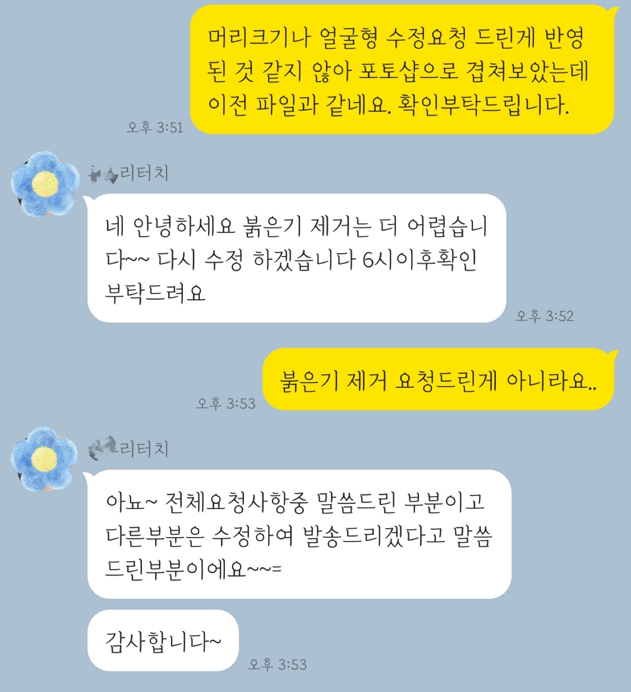 아, 일단 결론부터 말하자면 나는 보정 강도 '중'으로 요청했고, 총 3번의 보정본을 받았다.