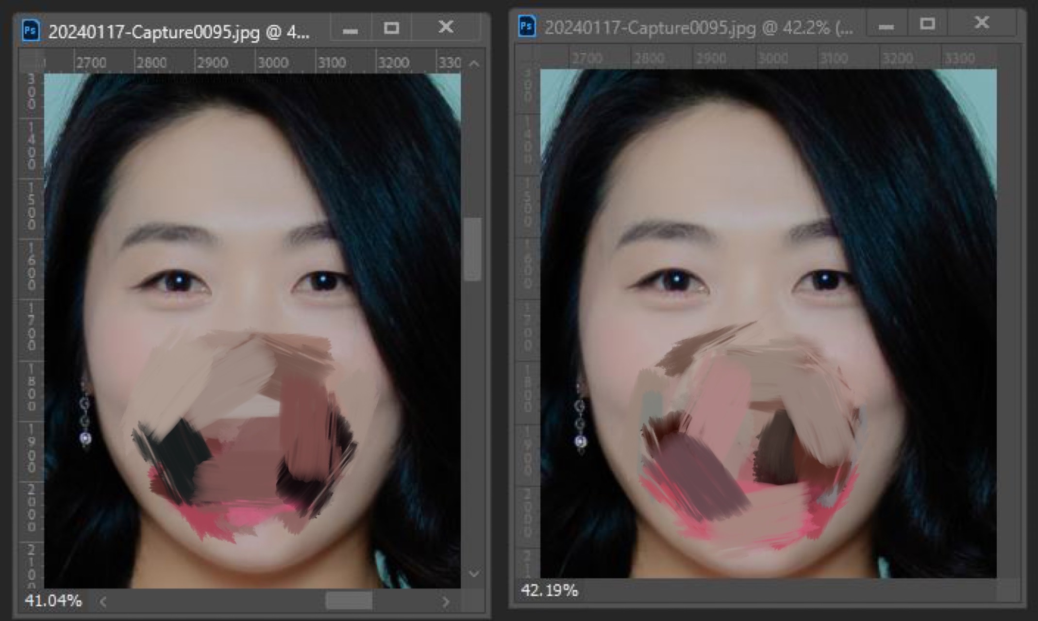 두 번째 보정본이 첫 번째 보정본이랑 아무리 봐도 달라진 게 없는 것 같아서 내가 포토샵으로 올려서 두 개를 겹쳐봤더니